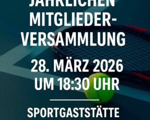 Einladung zur jährlichen Mitgliederversammlung Liebe Vereinsmitglieder, hiermit laden wir euch herzlich zur jährlichen Mitgliederversammlung unseres Tennisvereins ein. Datum: Samstag, 28. März 2026 Uhrzeit: 18:30 Uhr